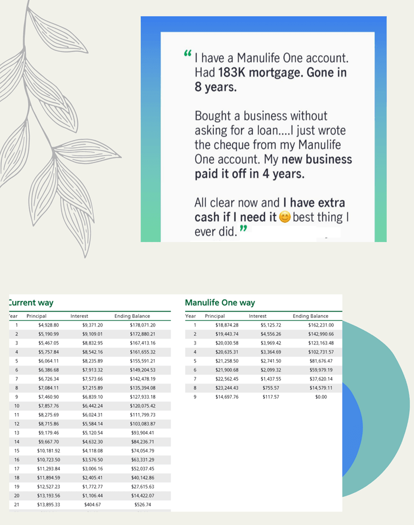 This client moved his accounts to Manulife Bank less than a decade ago. He had a relatively small mortgage at the time but a high interest rate. He was able to consolidate his savings, his debt and home equity and paid off his mortgage within 8 years on a relatively modest income. He had excellent credit and good cashflow. Once he paid down his Manulife One account, he then bought a franchise without having to seek approval from anyone. He just wrote a cheque and then paid that off completely within 4 years. Now he earns interest on his significant positive balance and he still has access to the credit limit if he ever needs additional cash.